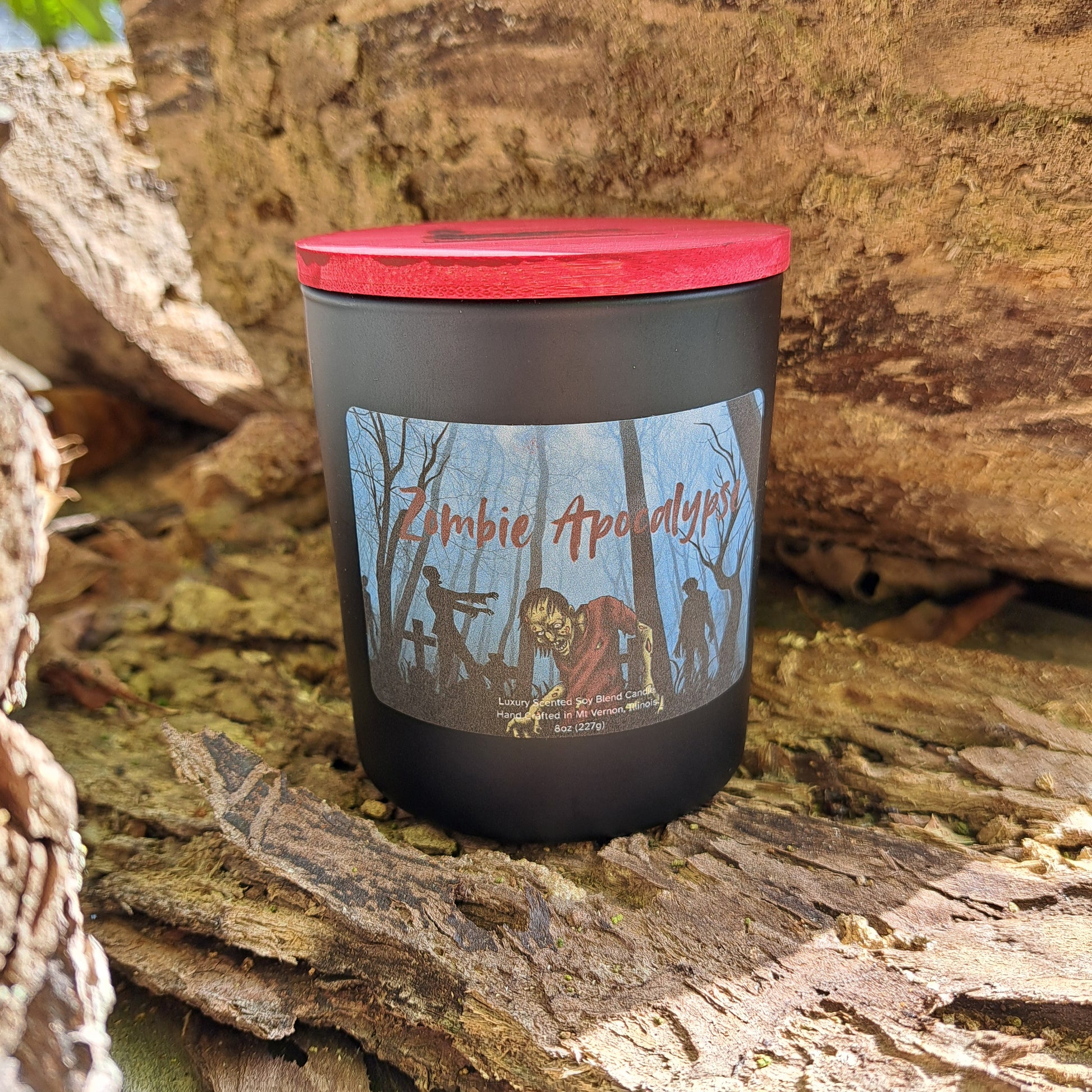 Zombie Apocalypse is one of the six limited-edition 8oz candles in the 2025 Horror Collection. This unique scent is very unusual. It's cool, damp, mossy, and downright creepy! Earthy top notes, Mossy Middle notes, and a base of cedarwood round out this damp, earthy, spooky scent. The candle is hand crafted in a black glass jar, adorned with a horror themed graphic label and red wooden lid, hand branded with the Burn Candle Co. logo. To purchase the entire six candle collection, select "The 2025 Horror Collection'.